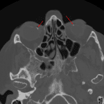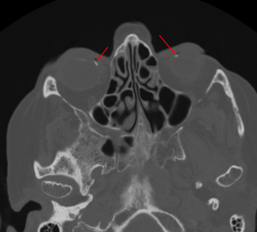 • No acute fracture or foreign body.  Small calcification at the insertion sites of the medial rectus muscles bilaterally, compatible with benign calcified scleral plaques.