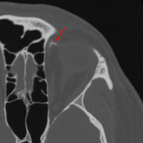 • Curvilinear calcification in the upper inner post-septal soft tissues bilaterally corresponds to the trochlea, a normal physiologic/developmental variant.