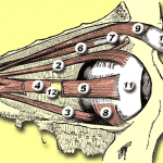 7 = Trochlea. 6 = Superior oblique muscle. Illustration by Edelhart Kempeneers/ Public domain via Wikimedia (https://commons.wikimedia.org/wiki/File:Eyemuscles.png) Left trochlear calcification (red arrow)