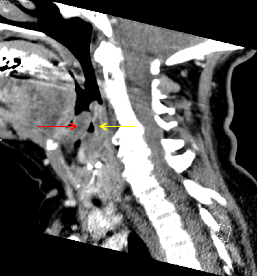 More discrete peripherally enhancing collection measuring 10 x 5 mm along the posterior wall of the hypopharynx is concerning for a small abscess.