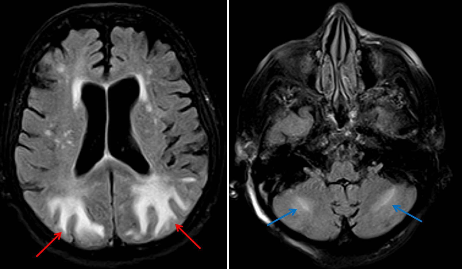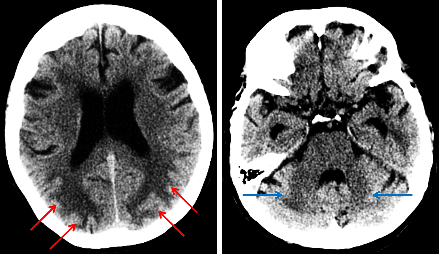 Sample ReportPosterior predominant white matter hypoattenuation involving the bilateral parieto-occipital regions and cerebellum in a pattern most suggestive of posterior reversible encephalopathy syndrome (PRES). Recommend brain MRI for further evaluation.