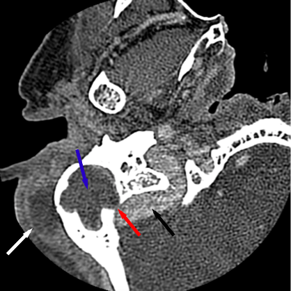 No evidence of intracranial extension. The right sigmoid sinus is patent.