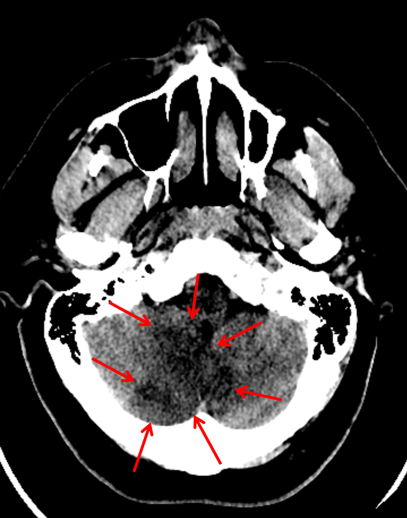 • Areas of hypodensity and loss of gray-white differentiation in the medial right greater than left cerebellar hemispheres