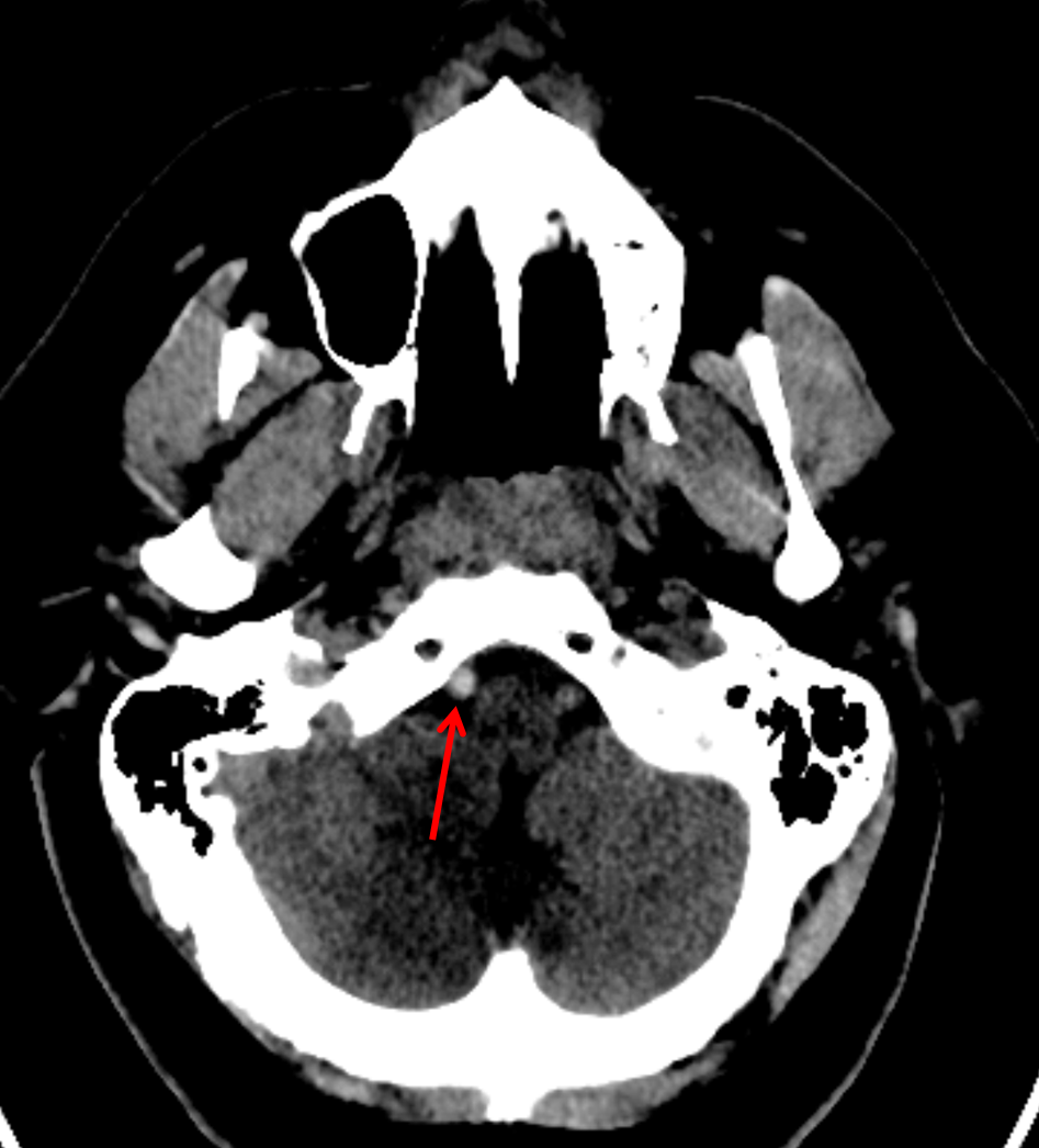 Hyperdense appearance of the intradural right vertebral artery, suggesting the presence of thrombus.