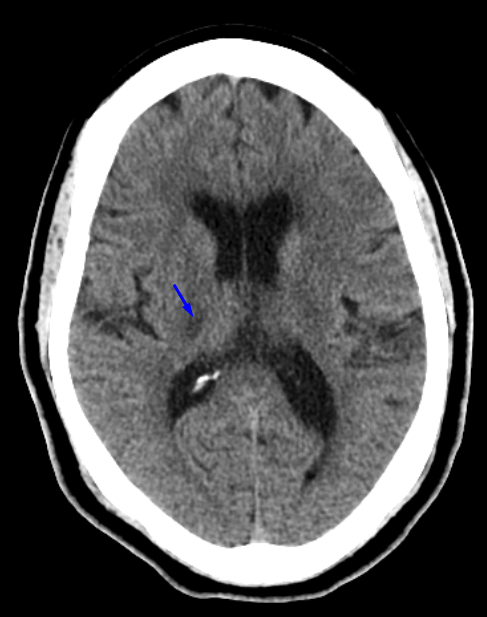 • Areas of hypoattenuation in the posterior limb of the right internal capsule, inferior left thalamus, right hemipons, and right cerebellar hemisphere