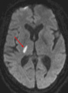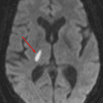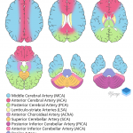 Low density in the posterior limb of the right internal capsule (blue arrow) consistent with internal capsule lacunar infarct. Area of diffusion signal hyperintensity (red arrow), which was also hypointense on the ADC map, consistent with acute/early subacute infarct. Cross-sectional arterial territories of the brain.