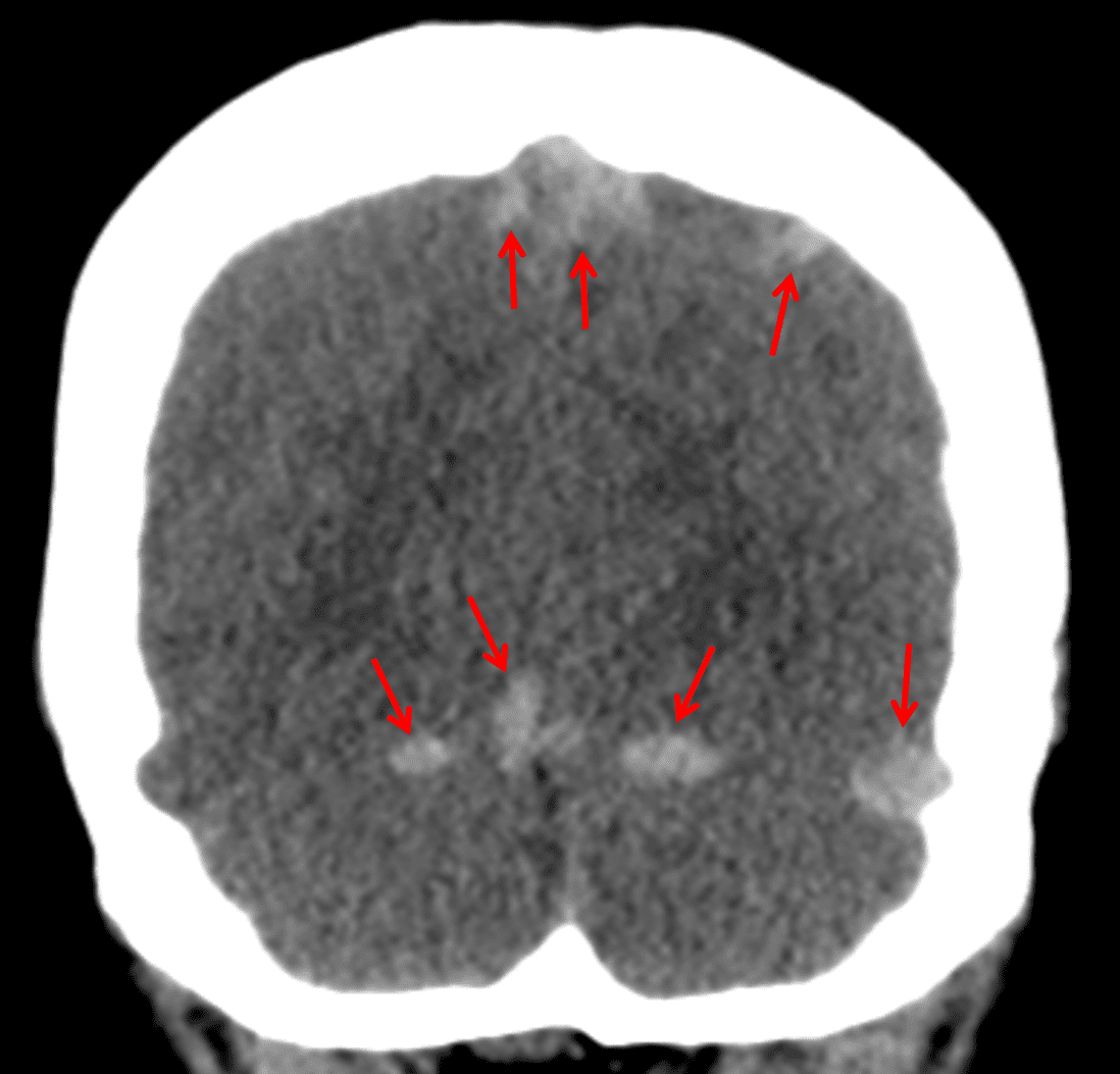 Sample ReportFindings concerning for thrombosis of the superior sagittal sinus, straight sinus, bilateral tentorial and cortical veins, both transverse sinuses, and the confluence of sinuses. Recommend brain MRI with and without contrast for further evaluation.