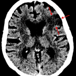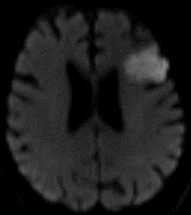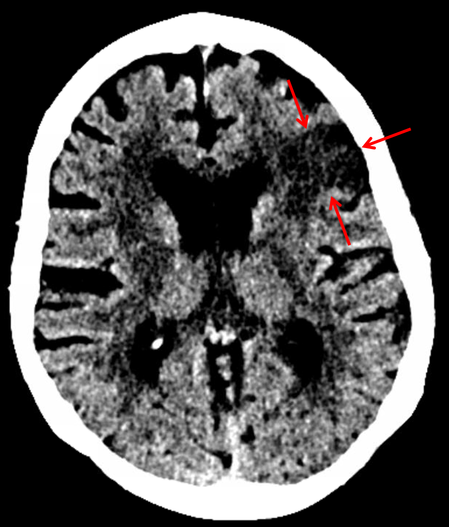 Sample ReportArea of loss of gray-white differentiation in the left frontal lobe concerning for acute/subacute infarct. No acute hemorrhage or mass effect. Recommend brain MRI for further evaluation.