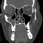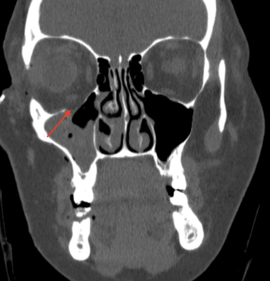 Sample ReportRight orbital floor blowout fracture with herniation of orbital fat through the fracture defect. Fracture extends inferiorly through the anterior and posterior walls of the right maxillary sinus with involvement of the infraorbital foramen and right maxillary hemosinus.