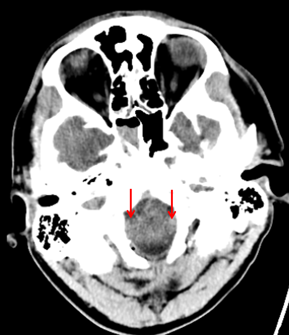 Otic capsule involving right temporal bone fracture with a visible fracture line (red arrow) and gas in the vestibular apparatus (yellow arrow). Inferior descent of the cerebellar tonsils into the foramen magnum (red arrows) with associated mild crowding at the cervicomedullary junction.
