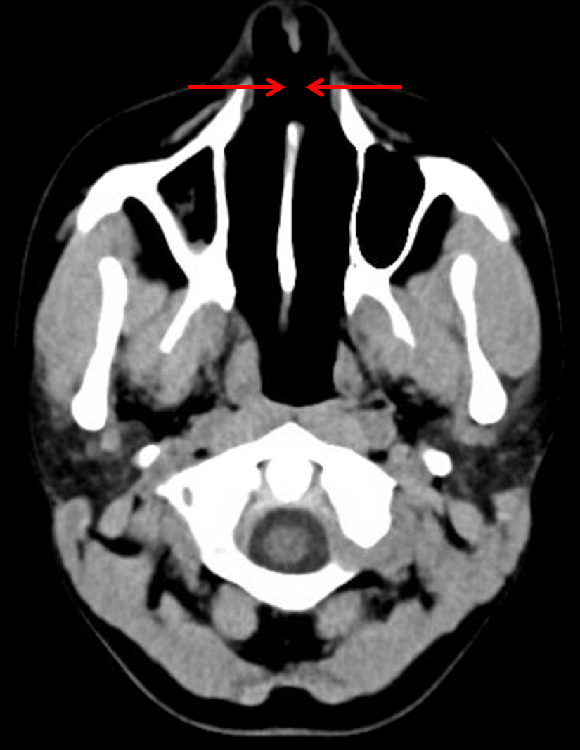 Anterior nasal septal perforation, which could be secondary to use of vasoconstrictive drugs, prior trauma or surgery, or granulomatous disease.