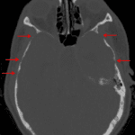 • Multifocal areas of calvarial thinning, particularly involving the bilateral greater sphenoid wings and squamous temporal bones and the cribriform plate