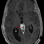 • Avidly, somewhat heterogeneously enhancing pineal region mass measuring 2.7 x 2 x 3 cm which engulfs the pineal calcification and exerts downward mass effect on the tectum resulting in obstructive hydrocephalus