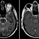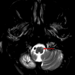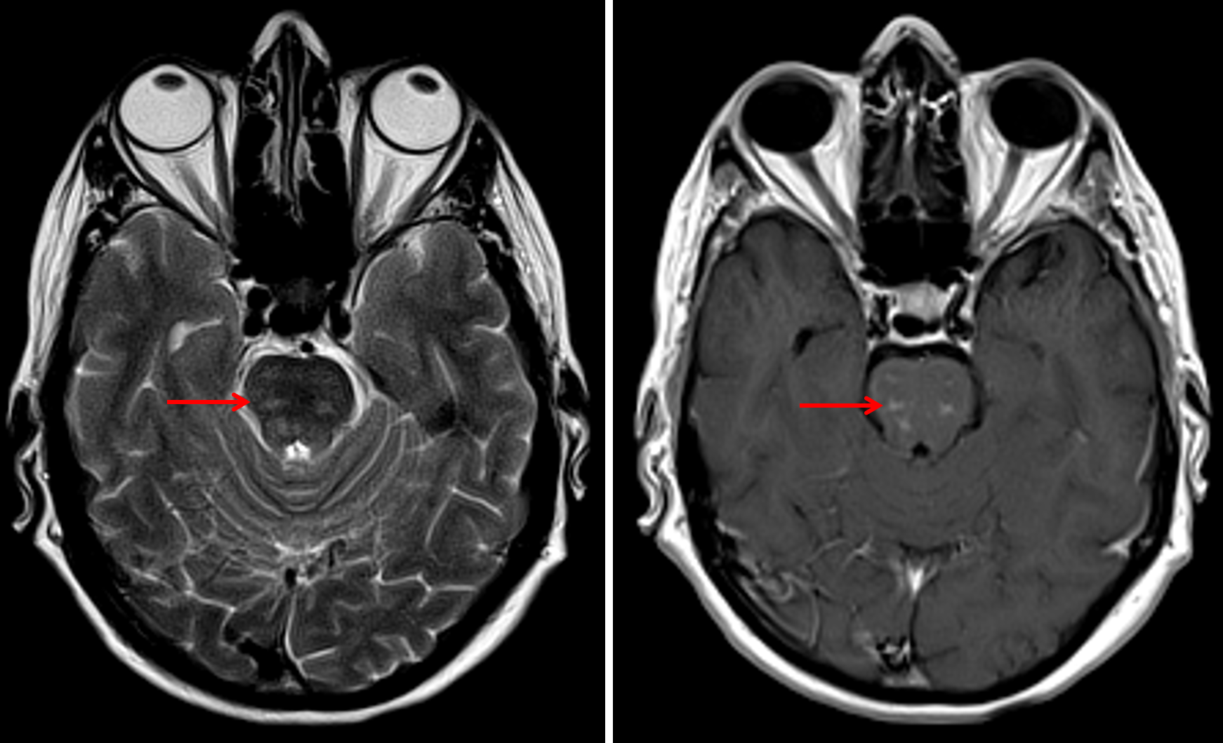 Relatively symmetric patchy T2 signal hyperintensity and enhancement in the pons (red arrows), which is a typical imaging appearance for CLIPPERS. Interestingly, this patient later developed hypertrophic olivary degeneration (red arrow) contralateral to their dentate nucleus involvement.
