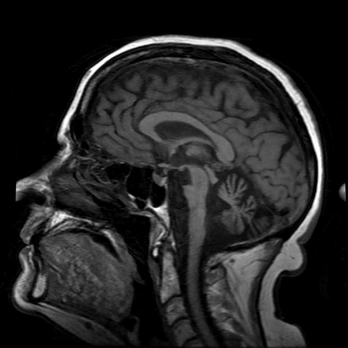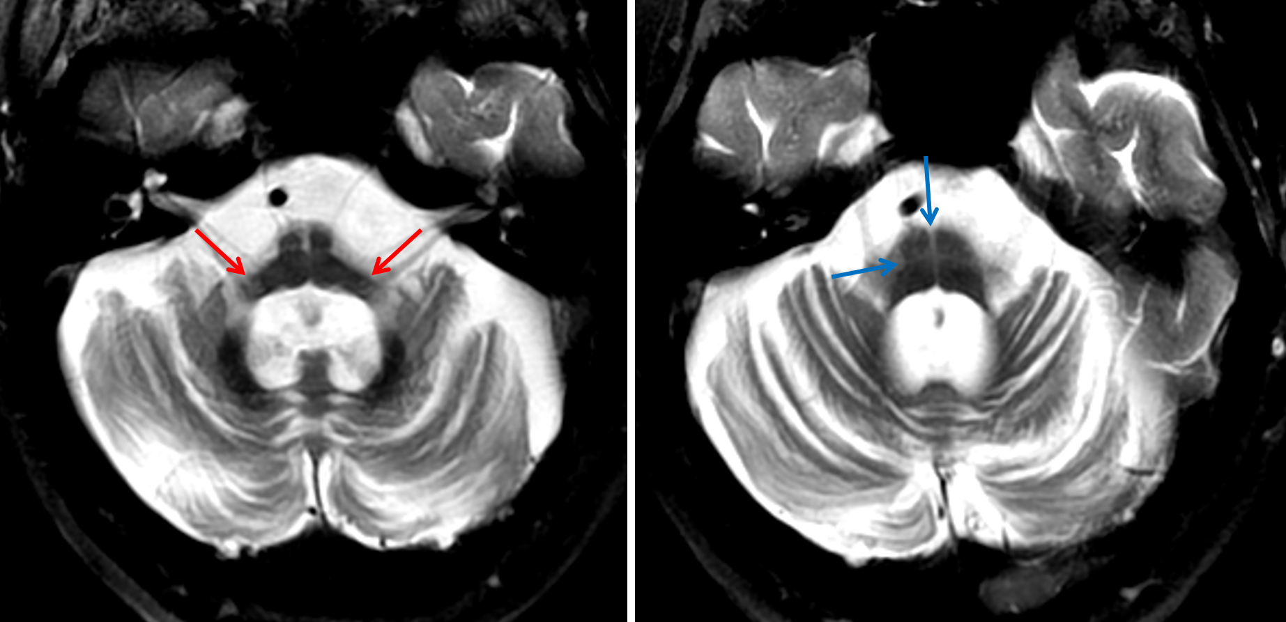 Sample ReportMarked pontocerebellar atrophy out of proportion to relatively mild supratentorial parenchymal volume loss. In combination with the finding of cruciform T2 signal hyperintensity in the pons at the level of the middle cerebellar peduncles (“hot crossed bun” sign), this appearance is most suggestive of cerebellar ataxia-type multiple system atrophy (MSA-C).