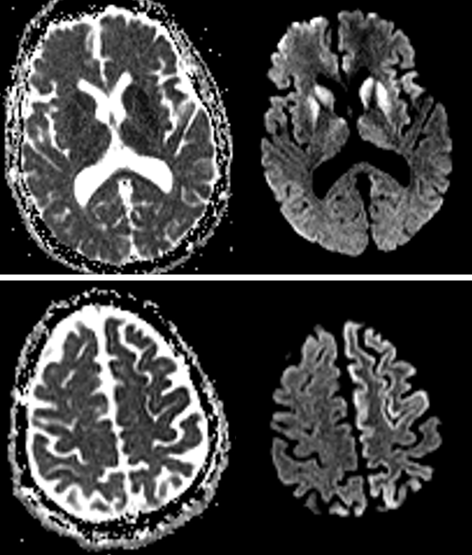 Sample ReportRestricted diffusion and T2/FLAIR signal hyperintensity involving the bilateral corpus striatum as well as patchy involvement of the cerebral cortex bilaterally, particularly in the left frontal lobe and left cingulate gyrus. Additional faint restricted diffusion involving the bilateral thalami. This appearance raises particular concern for Creutzfeldt-Jakob disease (CJD) in the clinical context of progressive neurologic decline.