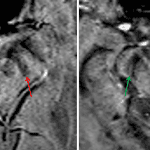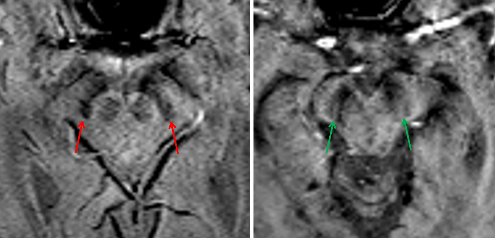 Loss of the normal hyperintense signal on SWI in nigrosome-1 in the patient with Parkinson disease on the left (red arrows) compared to an age-matched control on the right (green arrows).