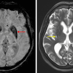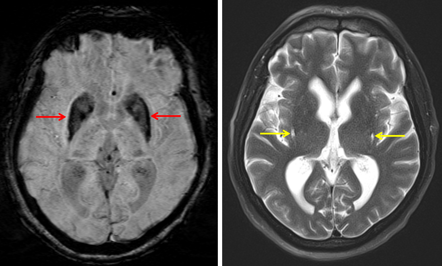 • Greater than expected susceptibility artifact involving the basal ganglia (particularly the lateral putamina), substantia nigra, red nuclei, and dentate nuclei with linear T2/FLAIR signal hyperintensity along the lateral putaminal margins/subinsular regions