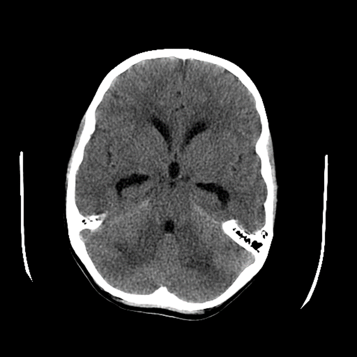 • Patchy hypoattenuation in the bilateral cerebellar hemispheres with mass effect in the posterior fossa resulting in crowding of the fourth ventricle and inferior descent of the cerebellar tonsils into the foramen magnum