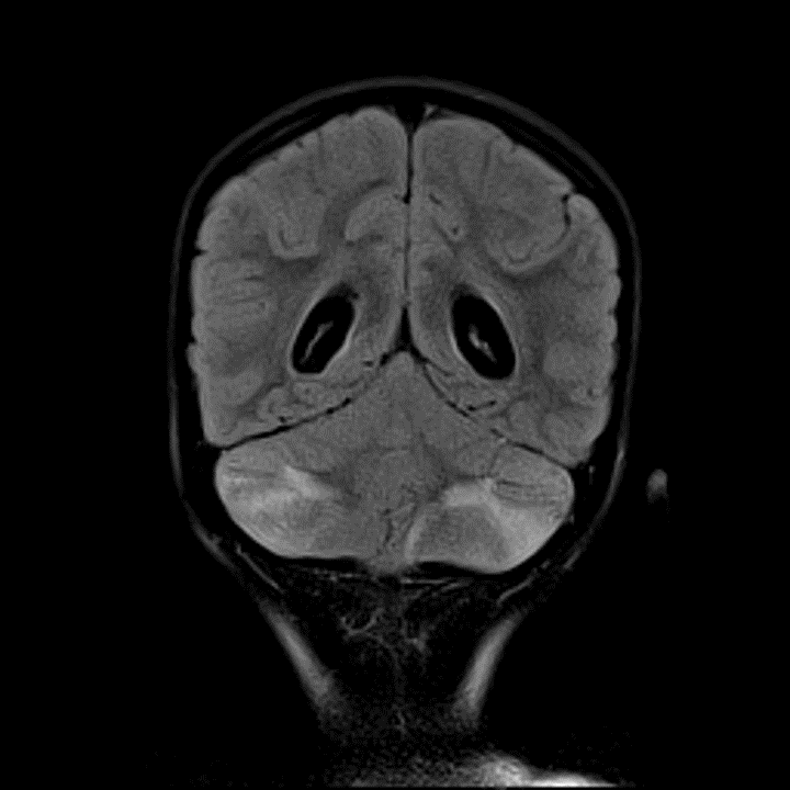 • Patchy T2/FLAIR hyperintensity involving gray and white matter in both cerebellar hemispheres with associated cerebellar swelling and partial effacement of the fourth ventricle