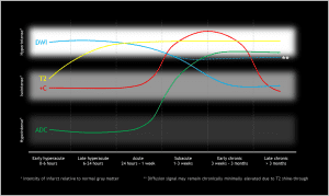 Evolution of signal on several MRI sequences in cerebral infarcts. +C = postcontrast imaging.