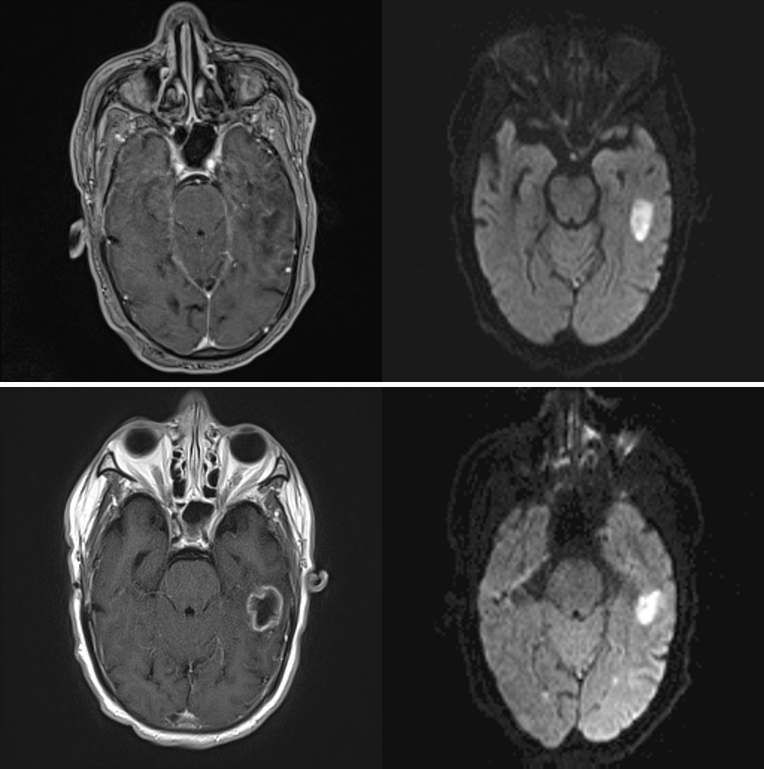 Sample ReportFindings concerning for late cerebritis/early abscess in the left inferior temporal gyrus with evidence of meningitis and ventriculitis. These findings likely represent a complication of left ostomastoiditis given proximity, which could be further evaluated with contrast-enhanced temporal bone CT. Recommend ENT and neurosurgical consultation.