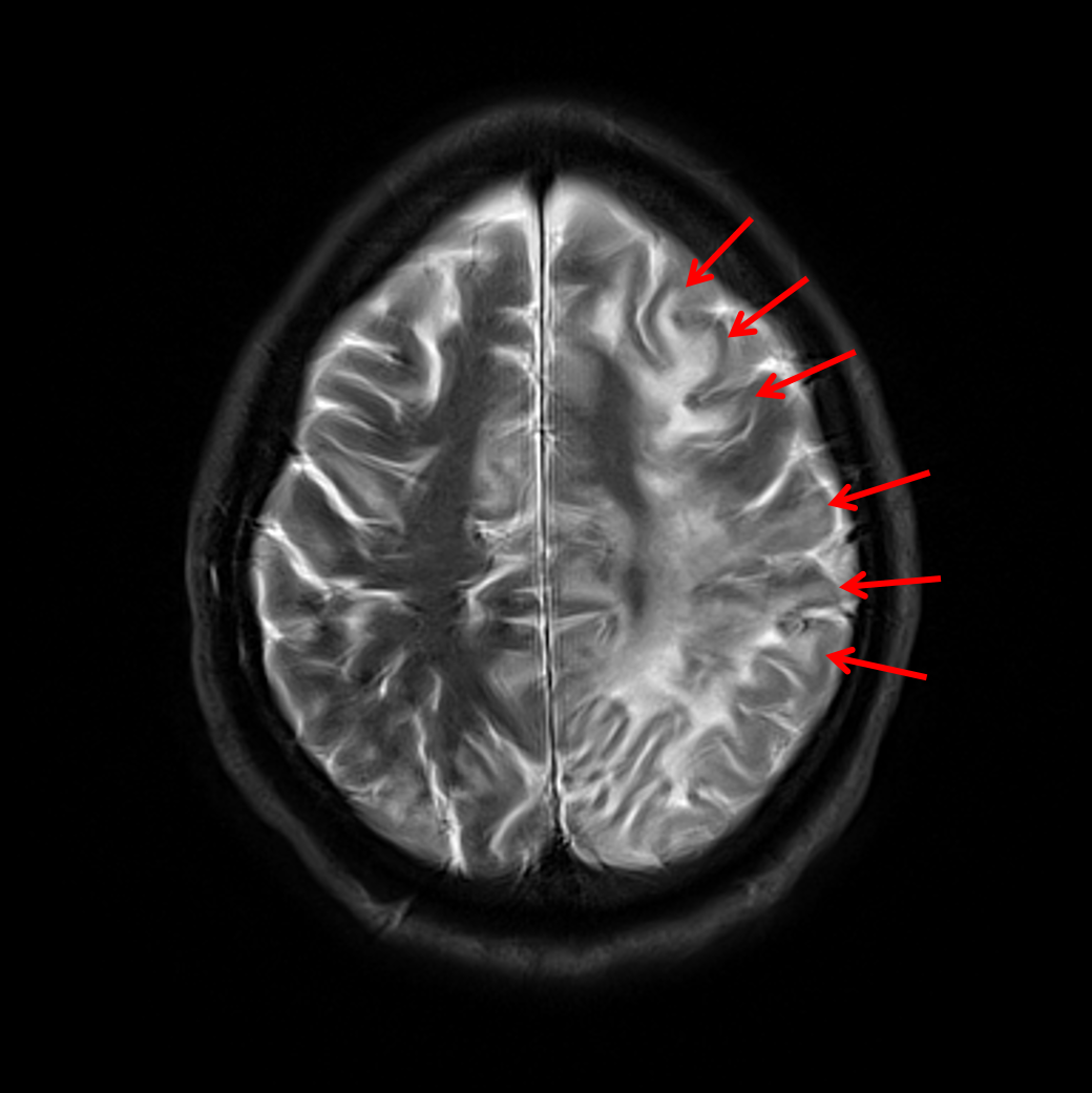 PML: Asymmetric T2 hyperintensity in the left frontoparietal white matter involving the subcortical U fibers (red arrows), which provides a stark signal contrast with the adjacent cortex.
