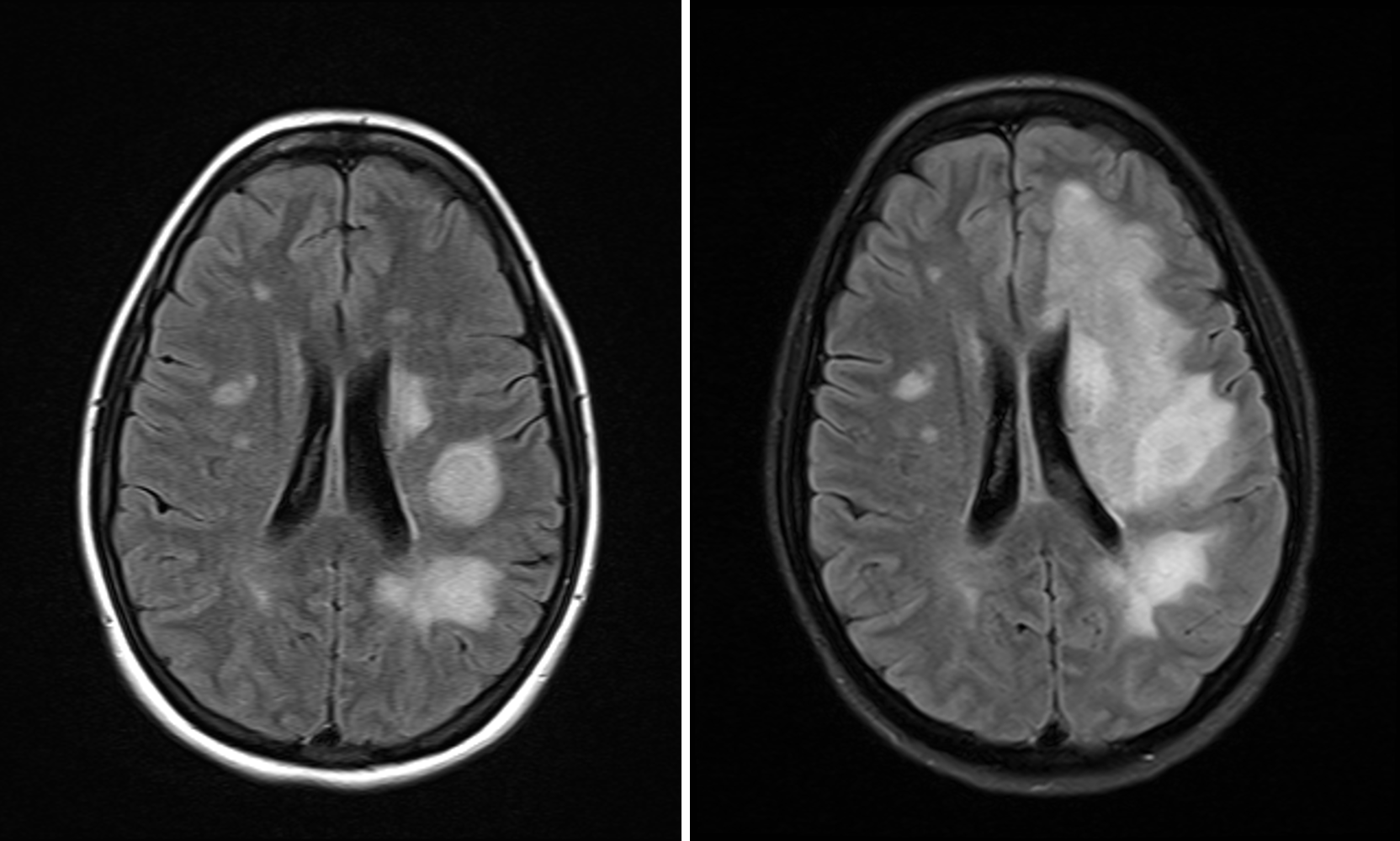 Sample ReportMarkedly increased extent of T2/FLAIR signal hyperintensity without enhancement throughout the left frontal and parietal lobes extending into the posterior limb of the left internal capsule and ventrolateral left thalamus, which given abruptness of change most likely represents immune reconstitution inflammatory syndrome (IRIS) in this patient on treatment for multiple sclerosis.