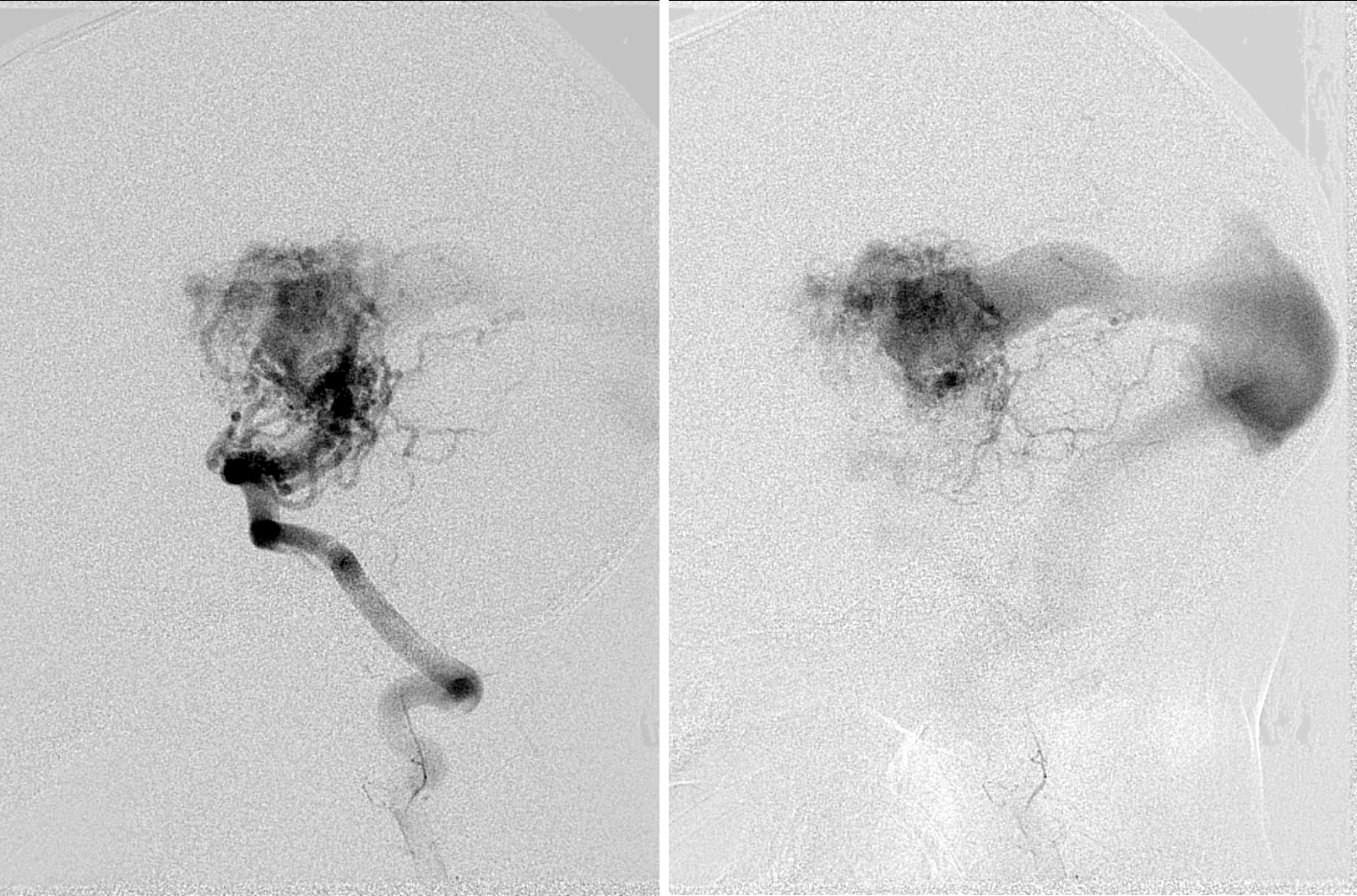 Sample ReportVein of Galen aneurysmal malformation with evidence of prior embolization in the area of pericallosal ACA branches and the bilateral lateral ventricles. There are likely multiple feeding arteries from the left greater than right PCAs, though feeding arterial supply is difficult to confidently determine on this noncontrast study. Recommend catheter angiography for further evaluation.