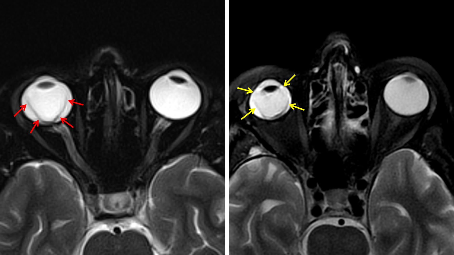 Sample ReportRight retinal detachment with enhancement of the displaced membranes and of the posterior aspect of the right globe, which though nonspecific could relate to chorioretinitis. Recommend ophthalmology evaluation.