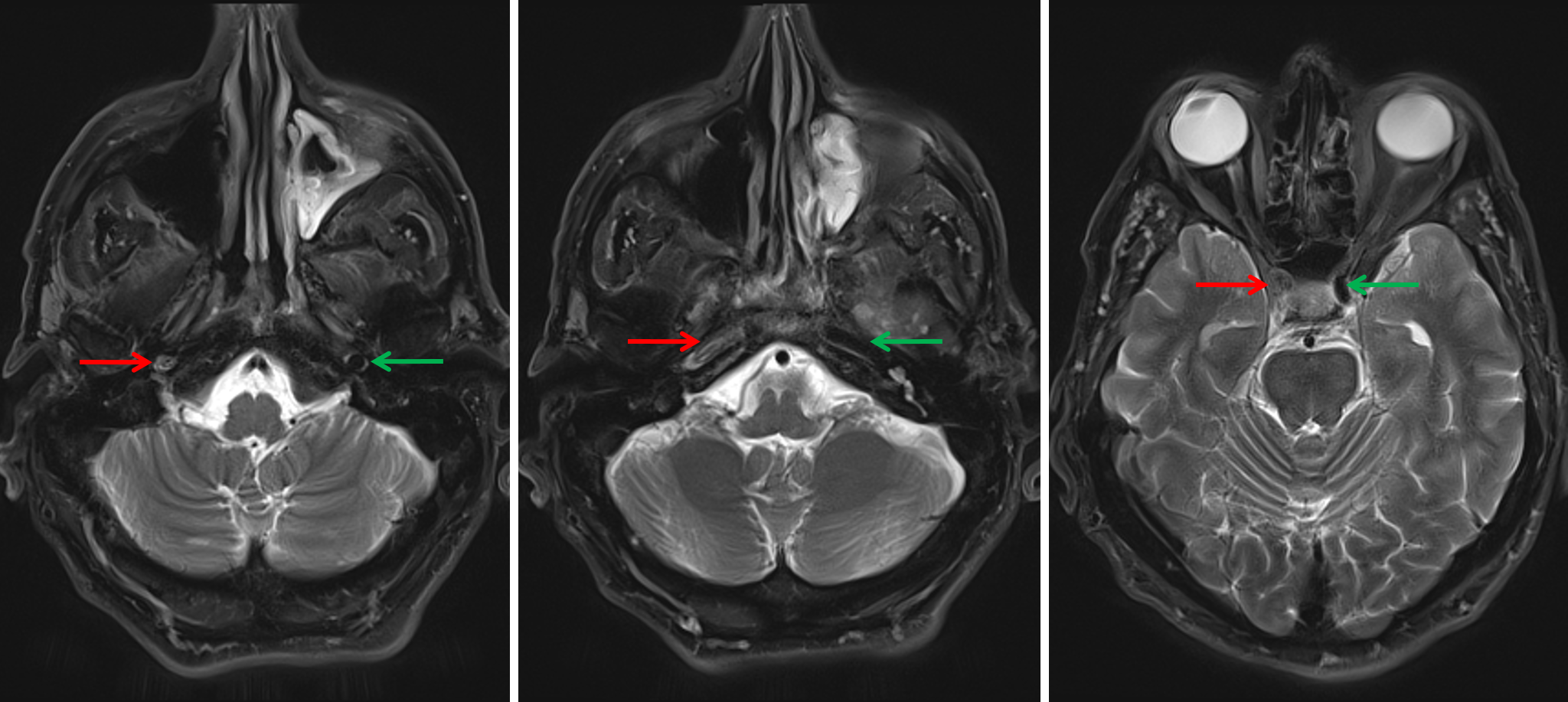 Abnormal signal in the right internal carotid artery (red arrows) on this T2-weighted sequence compared to the normal flow-related signal loss in the left internal carotid artery (green arrows).