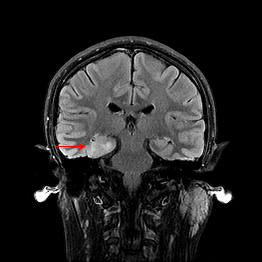 Sample ReportExpansile, T2/FLAIR hyperintense lesion in the right parahippocampal gyrus and in the adjacent right fusiform gyrus, which could represent viral encephalitis (including herpes encephalitis), edema related to recent seizure activity, or a low-grade glioma. If there is clinical concern for infectious encephalitis, recommend presumptive treatment awaiting CSF analysis. Recommend short interval followup imaging to monitor for signal resolution in order to rule out neoplasm.