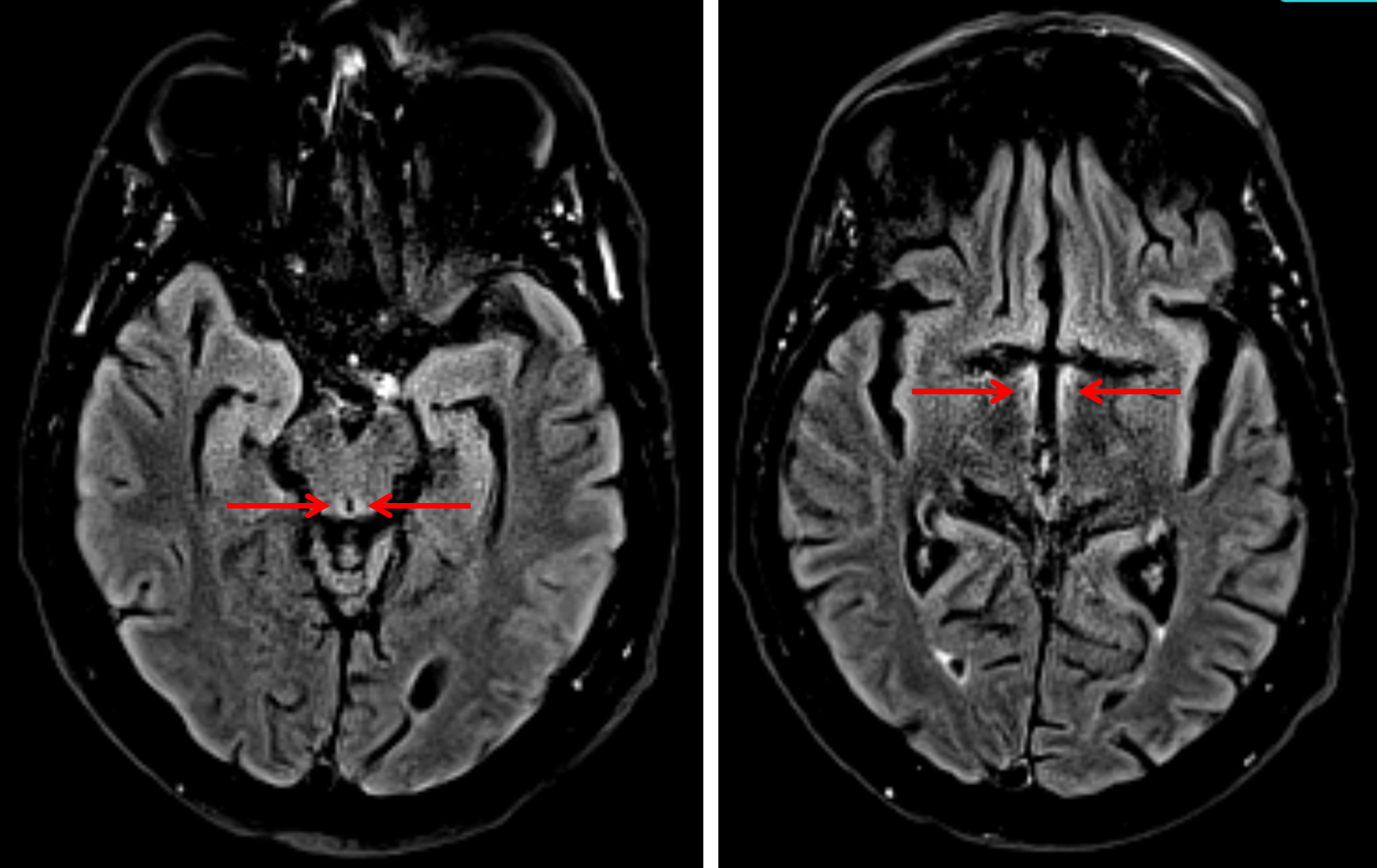 Areas of faint T2/FLAIR signal hyperintensity in the periaqueductal gray matter, medial thalami, and hypothalamus, which can be seen with Wernicke encephalopathy.