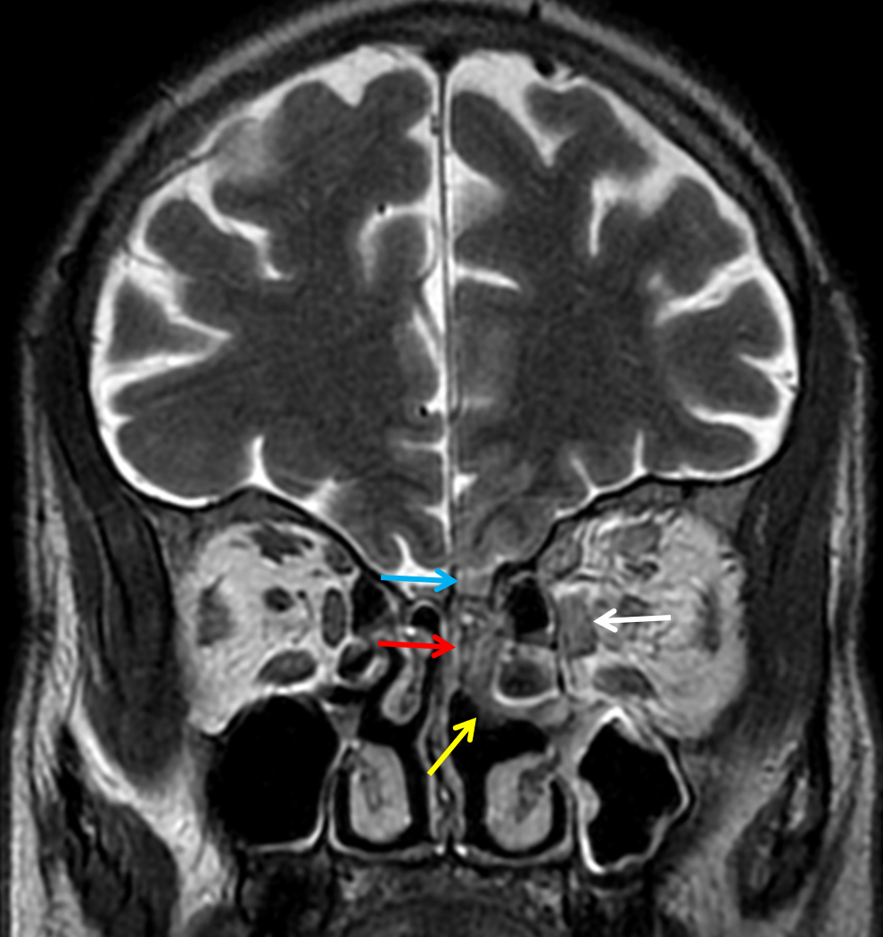 Invasive fungal sinusitis involving left ethmoid air cells and extending along the left middle turbinate (yellow arrow), into the left olfactory recess (red arrow), along the floor of the left anterior cranial fossa (blue arrow), and into the left orbit with thickening of the left medial rectus muscle (white arrow).