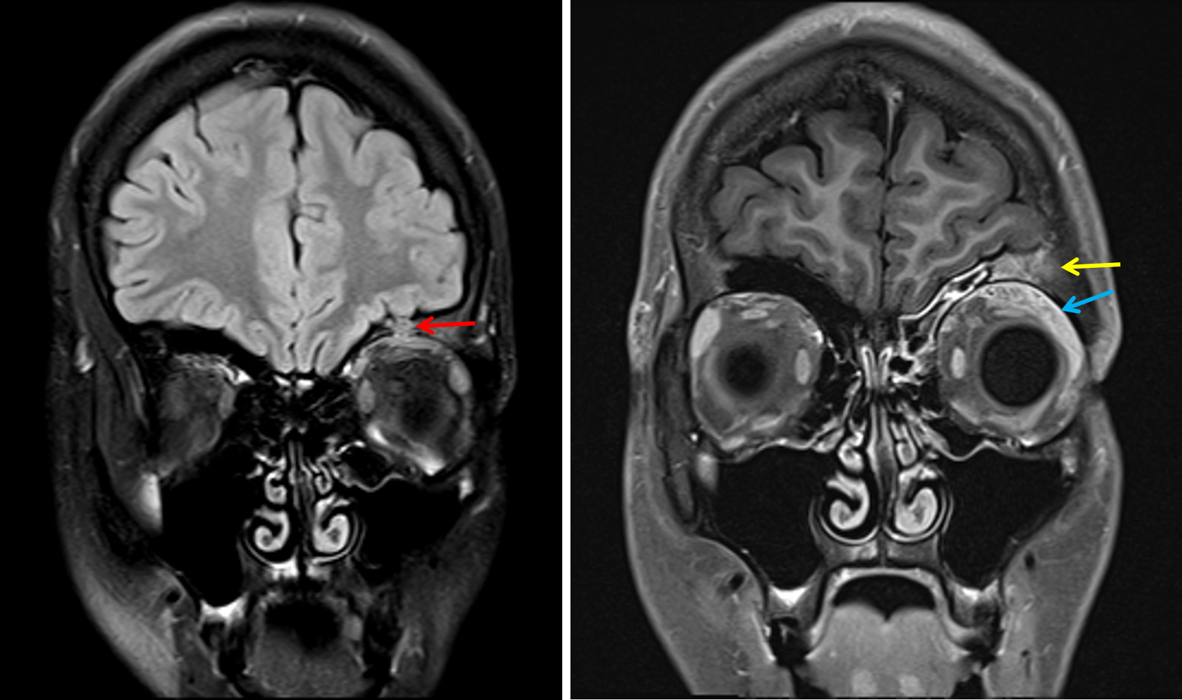 Sample ReportEnhancing osseous lesion centered in the left orbital roof lateral to the left frontal sinus with intraorbital extension along the superior and lateral margins of the superior muscular complex and slight intracranial extension along the floor of the left anterior cranial fossa. Differential considerations include inflammatory lesions such as IgG4-related disease and Langerhans cell histiocytosis, infection, and neoplasm. Left frontoethmoid sinus disease, which may be reactive and is considered less likely to be the source for the left orbital roof lesion. Consider tissue sampling for further evaluation.