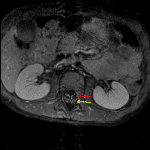 Abnormal enhancement of nerve roots in the cauda equina with the ventral roots (red arrow) enhancing more avidly than the dorsal roots (yellow arrow) in this patient with Guillain-Barre syndrome.