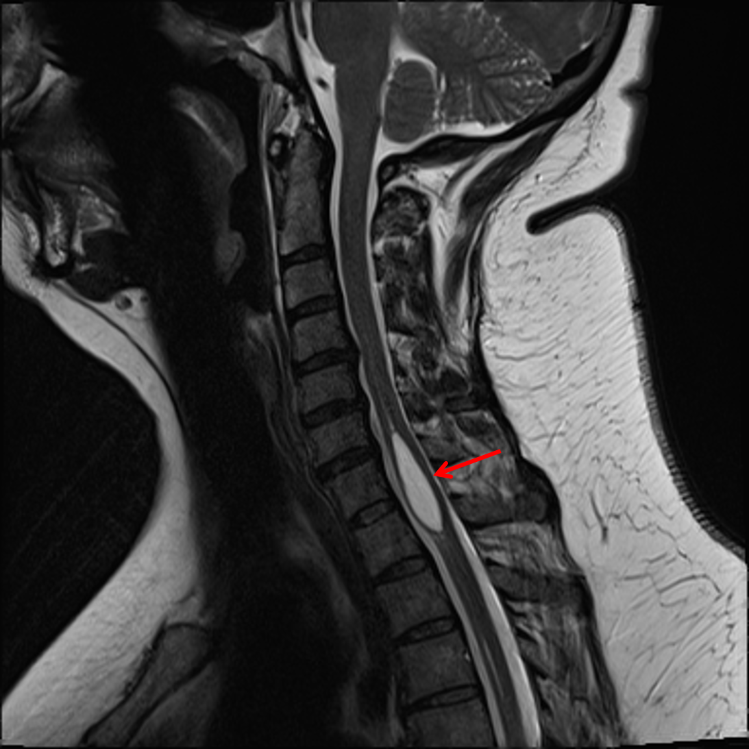 Syrinx at the cervicothoracic junction (red arrow).