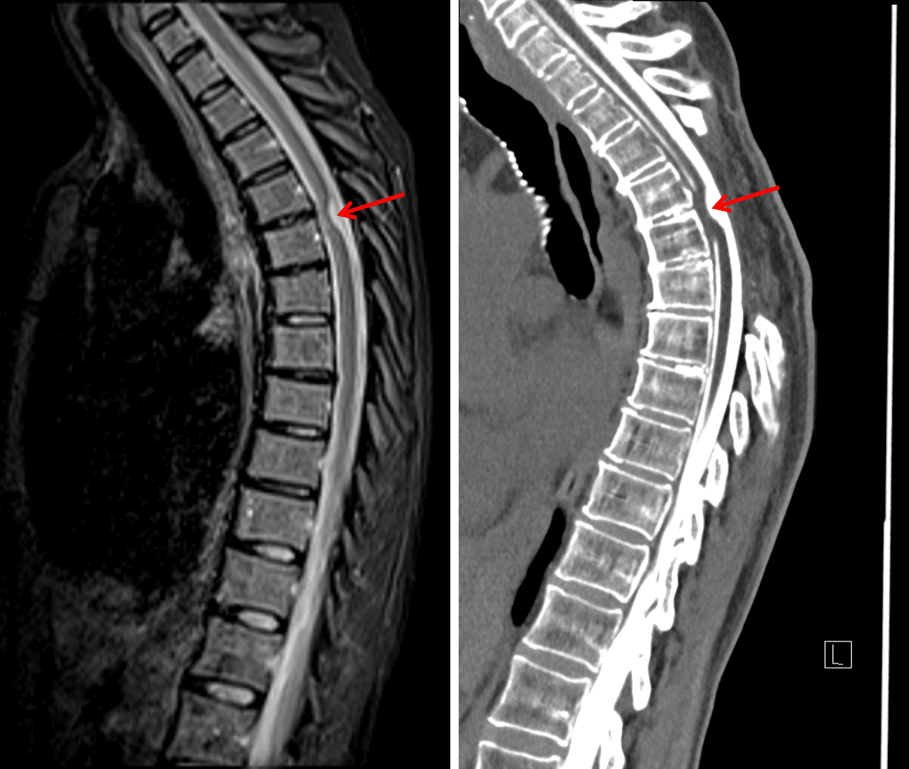 Ventral cord herniation through a dural defect (red arrows) shown on a preoperative MRI and subsequent CT myelogram which was performed after the patient did not have symptom relief from multilevel laminectomies and fenestration of the dorsal thecal sac.