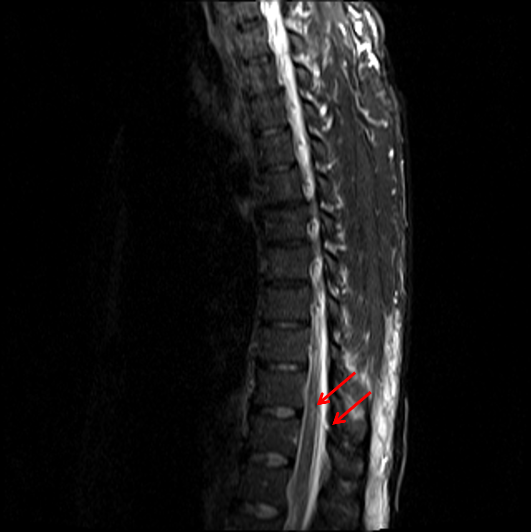 Sample ReportT2/STIR signal hyperintensity in the posterior paraspinal soft tissues on the left at the level of T11-T12 consistent with reported history of stab wound. A linear area of T2/STIR hyperintensity extends from this area into the left aspect of the spinal cord at the level of T10-T11, which raises concern for dural laceration and cord contusion/laceration.