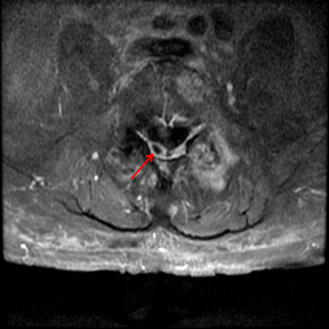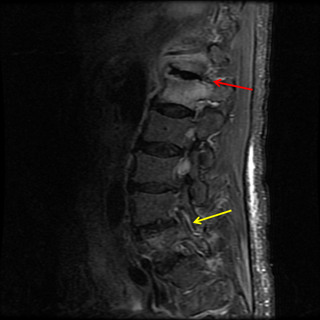 Sample ReportFindings consistent with left L4-L5 septic facet arthritis with associated osteomyelitis involving the adjacent articular pillars and surrounding phlegmon with intermixed scattered subcentimeter posterior paraspinal abscesses. Contiguous epidural phlegmon at the level of L5 with a 1 cm epidural abscess in the right dorsal epidural space.