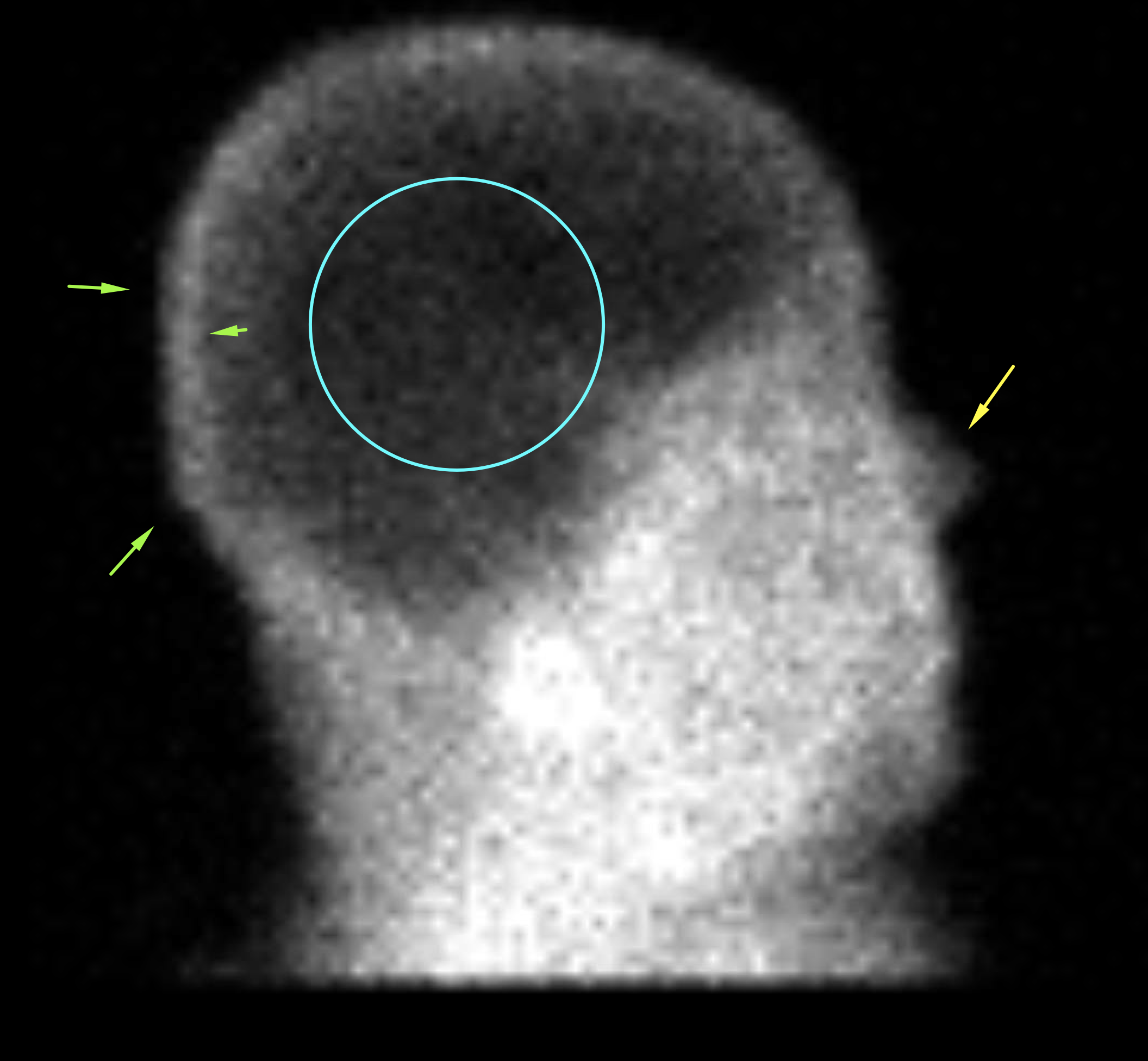 • Static images show good perfusion of the face and scalp without intracranial uptake of radiotracer