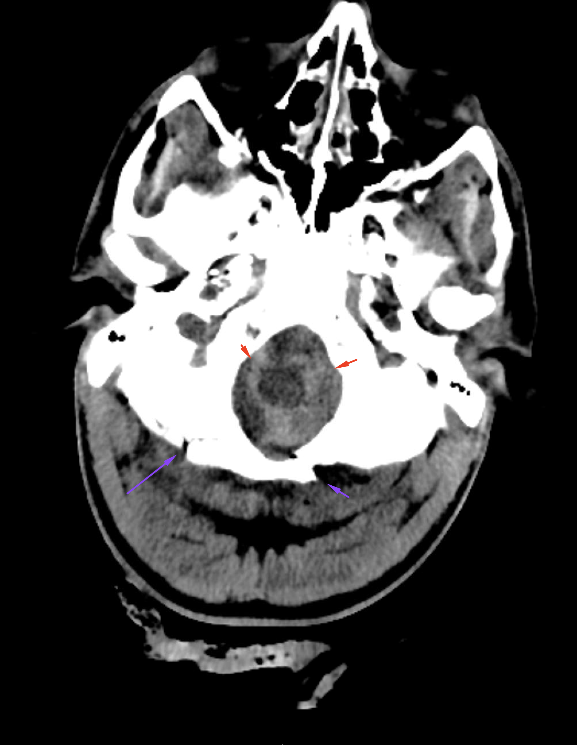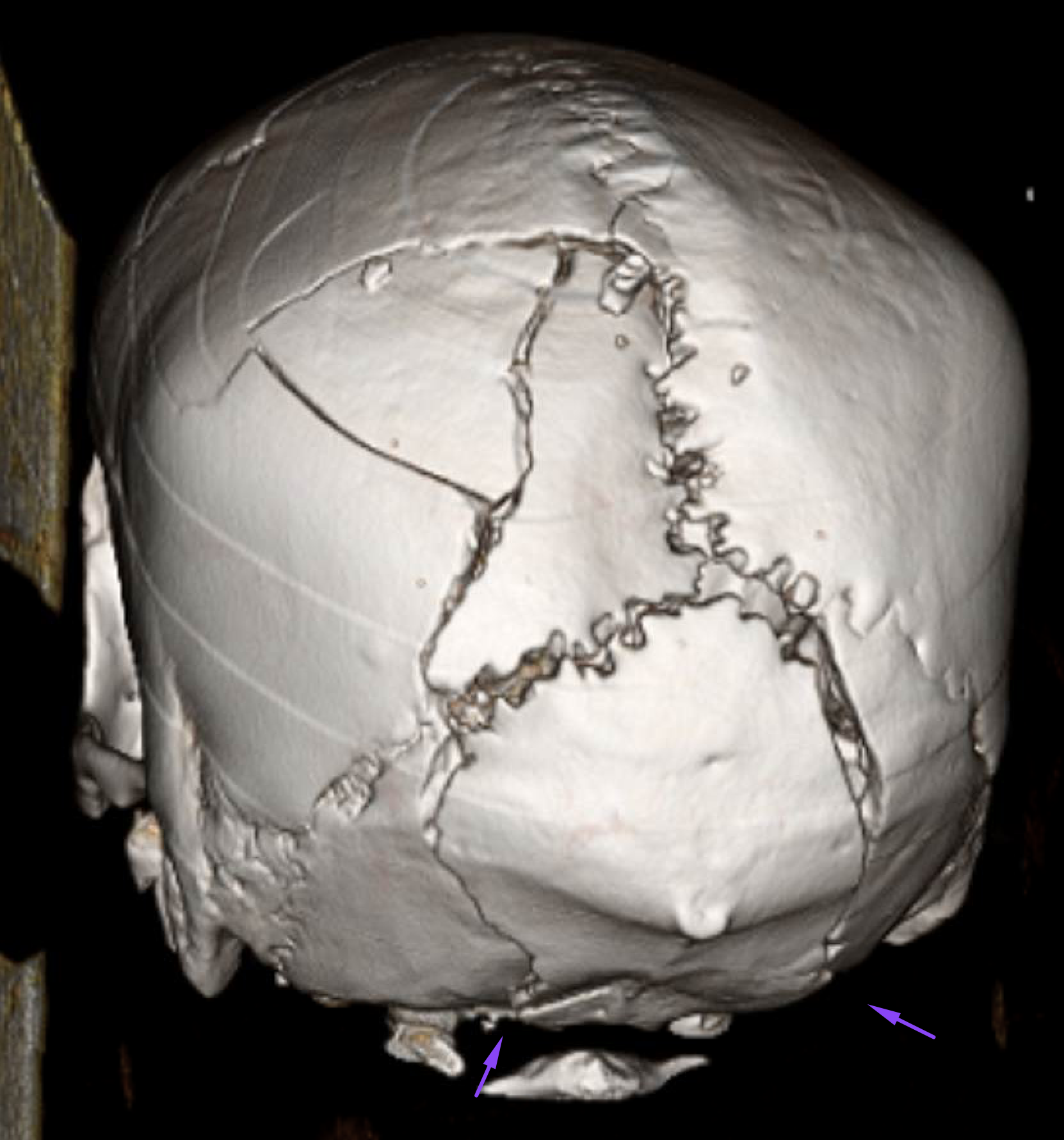 Flow imaging shows arrival of radiotracer in the major arteries of the neck (red arrows), the hot nose sign (yellow arrow), and normal scalp perfusion (green arrow). No intracranial activity is seen (blue circle). Lateral static view shows similar findings to angiographic phase imaging with absent intracranial activity (blue circle) despite maintained face (yellow arrow) and scalp perfusion (green arrows). Head CT in this trauma patient showing hemorrhage surrounding the brain stem at the level of the foramen magnum (red arrows). An occipital skull fracture is also seen (purple arrows). 3D CT rendering in this patient shows a comminuted skull fracture extending into the foramen magnum.