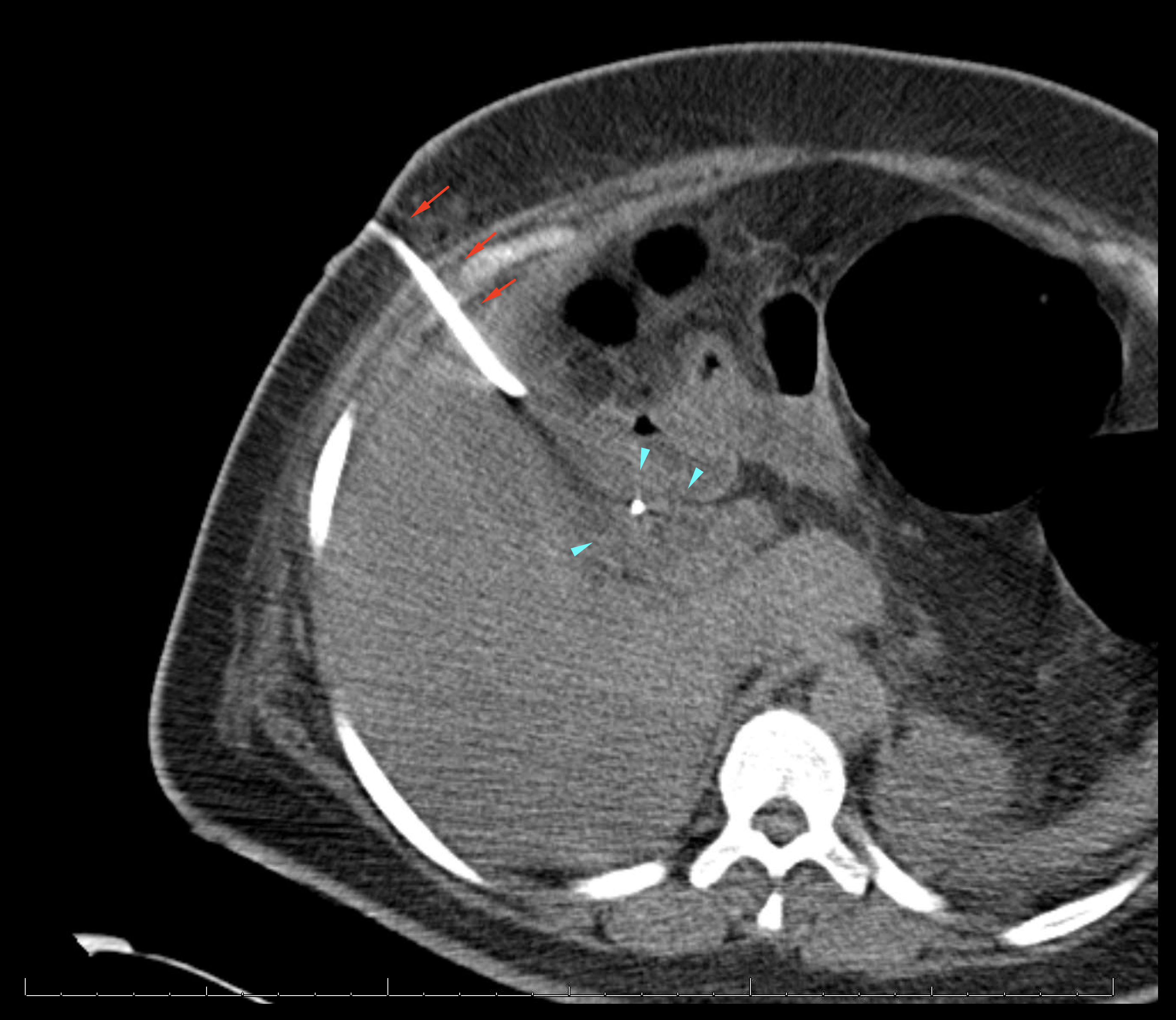 Sample ReportPostoperative biliary leak drained by the existing surgical drain. Small collection of bile in the gallbladder fossa.