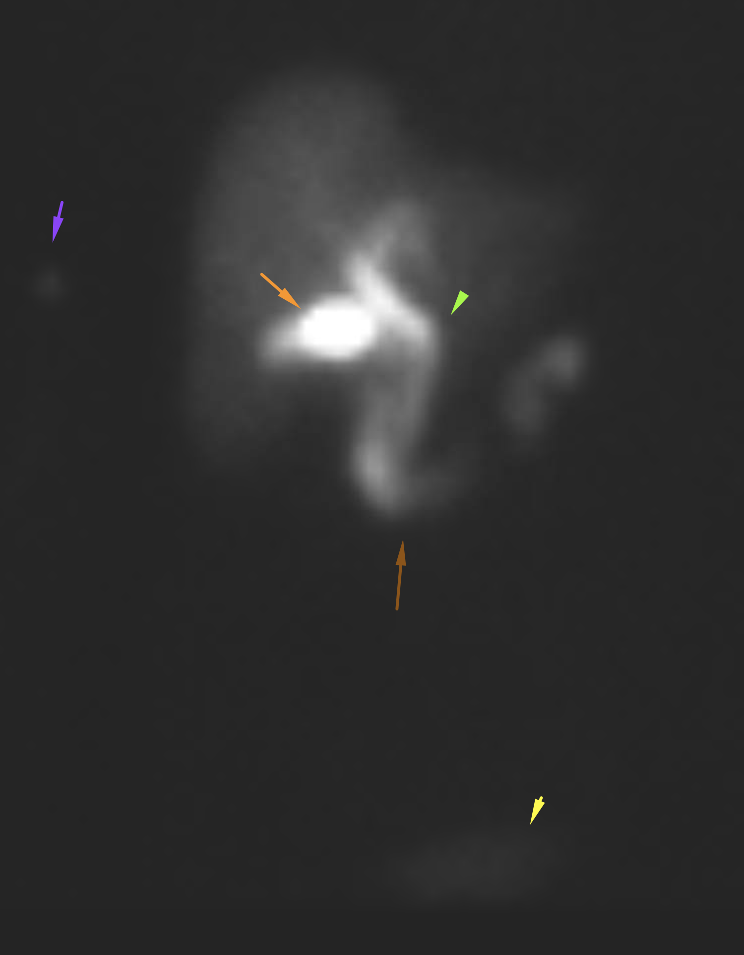 Injection site in the right arm (purple arrow). Normal activity in the gallbladder (orange arrow), common bile duct (green arrow), bowel (brown arrow), and bladder (yellow arrow).