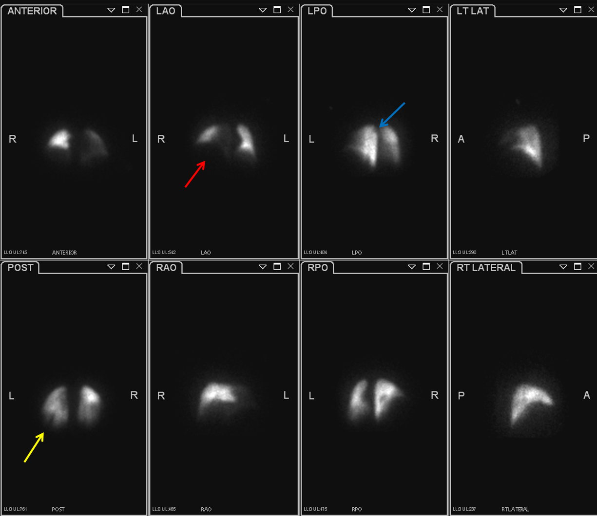 PIOPED Criteria: reference [Naoyuki et al] VQ terminology: reference [Ziessman et al] VQ lung segments: reference Sostman and Gottschalk. Three wedge-shaped perfusion defects are present: one large defect in the right lung base (red arrow), one moderate defect in the left lung base (yellow arrow), and one small defect in the left lung apex (blue arrow). Concentration and retention of xenon in the liver in this patient with hepatic steatosis (red arrows).