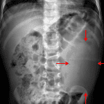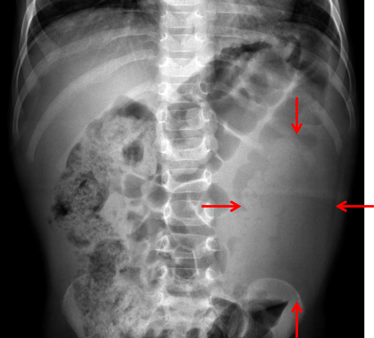 • Large soft tissue density in the left hemiabdomen with rightward displacement of multiple bowel loops