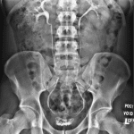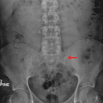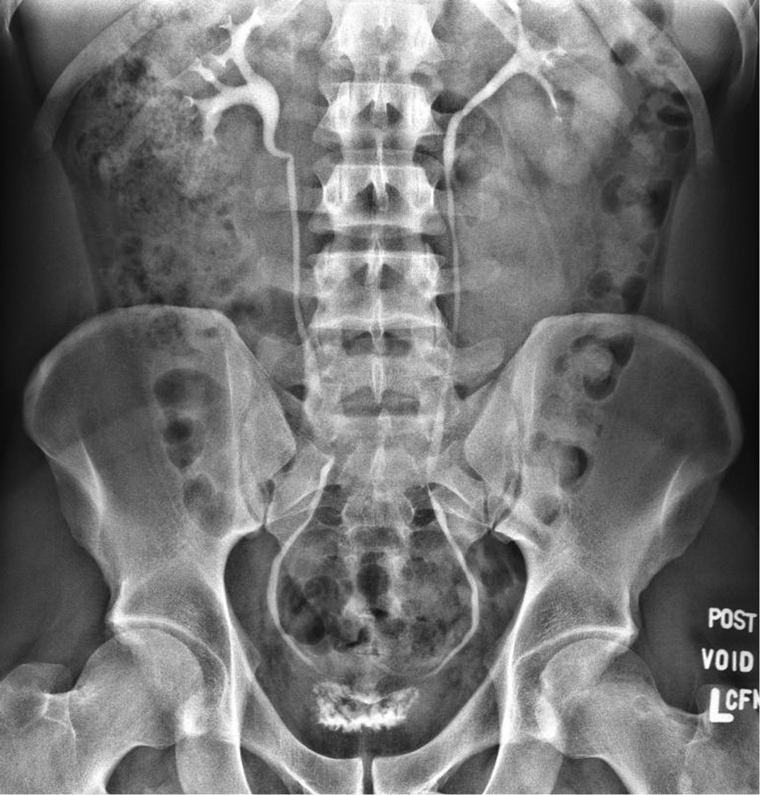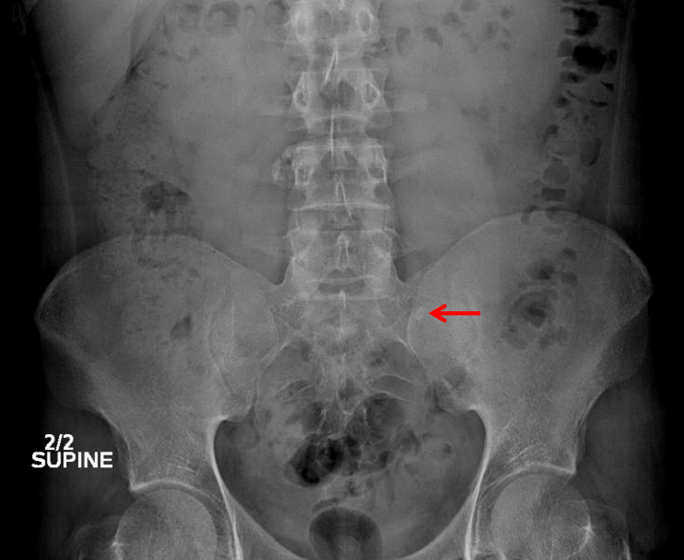 Calcific density measuring 5 mm overlying the left hemisacrum near the expected course of the left ureter, which may represent a ureteral stone. Consider noncontrast CT for further evaluation.