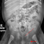 Mild irregularity of the proximal femoral and humeral metaphyses bilaterally, which could relate to rickets. Consider dedicated wrist radiographs for further evaluation.