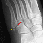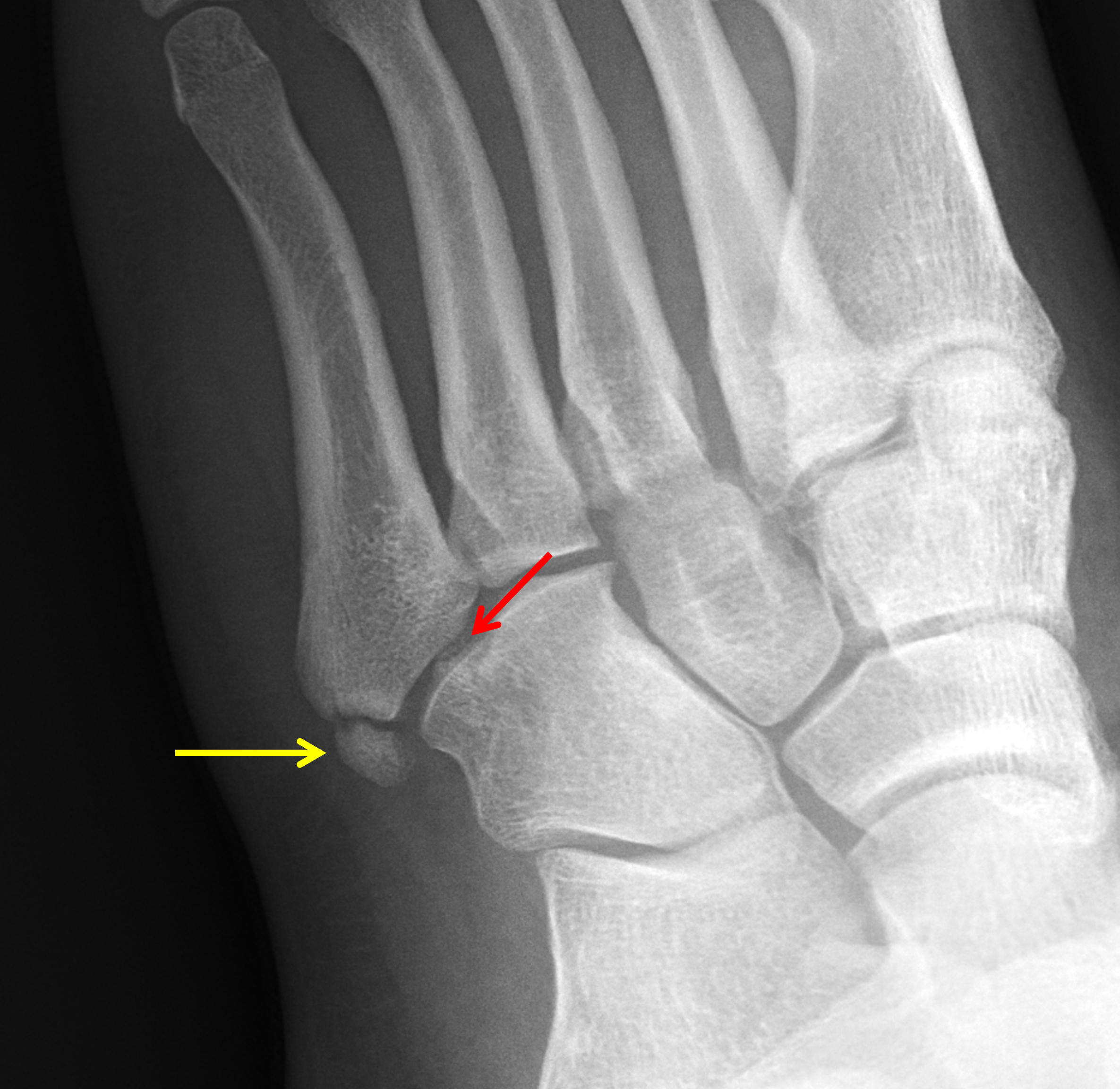 Acute nondisplaced fracture of the distal cuboid with a tiny fracture fragment in the fifth tarsometatarsal joint.