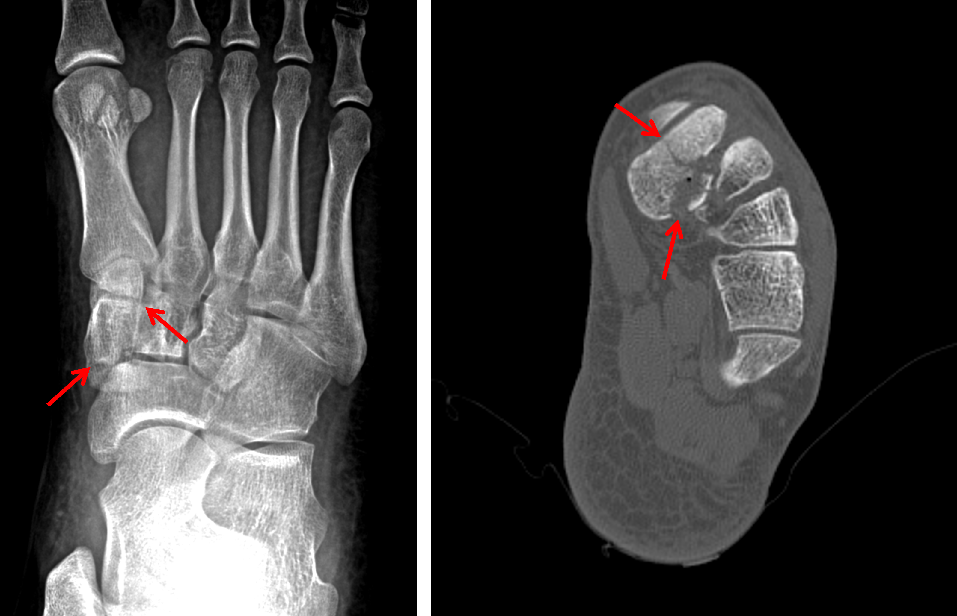 Sample ReportAcute comminuted fracture of the medial cuneiform with mild widening of the Lisfranc interval, consistent with Lisfranc fracture/dislocation. Consider CT to assess for additional injuries across the Lisfranc joint.